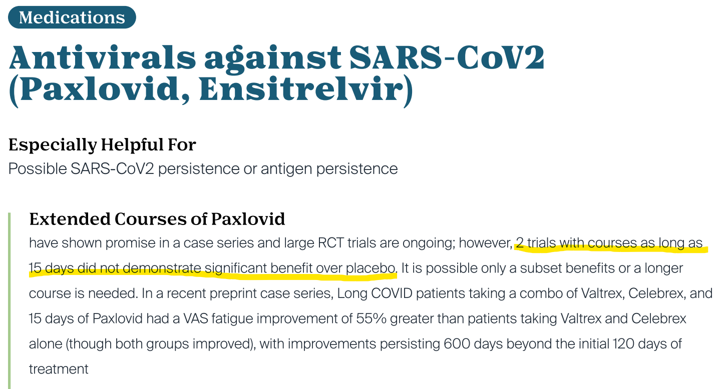 With no demonstrated efficacy and known safety issues (Paxlovid contains the HIV drug ritonavir), the current science suggests that Paxlovid for Long COVID will do more harm than good. The data points towards doing the opposite of what the guide suggests.